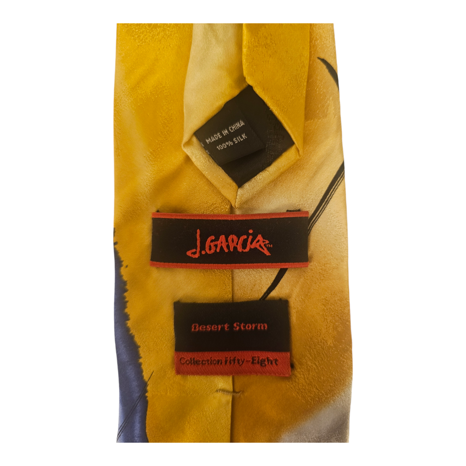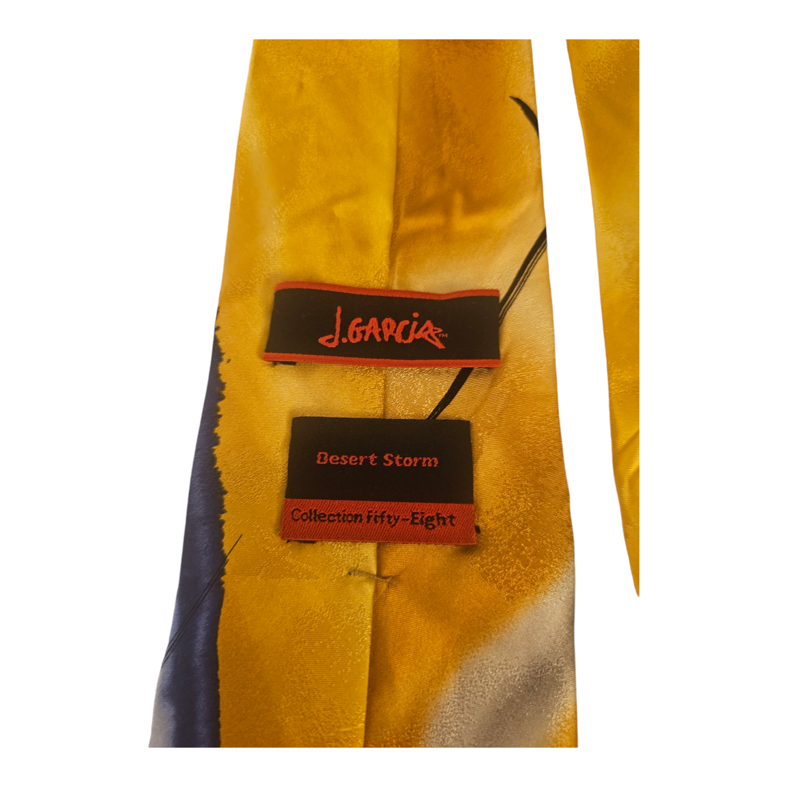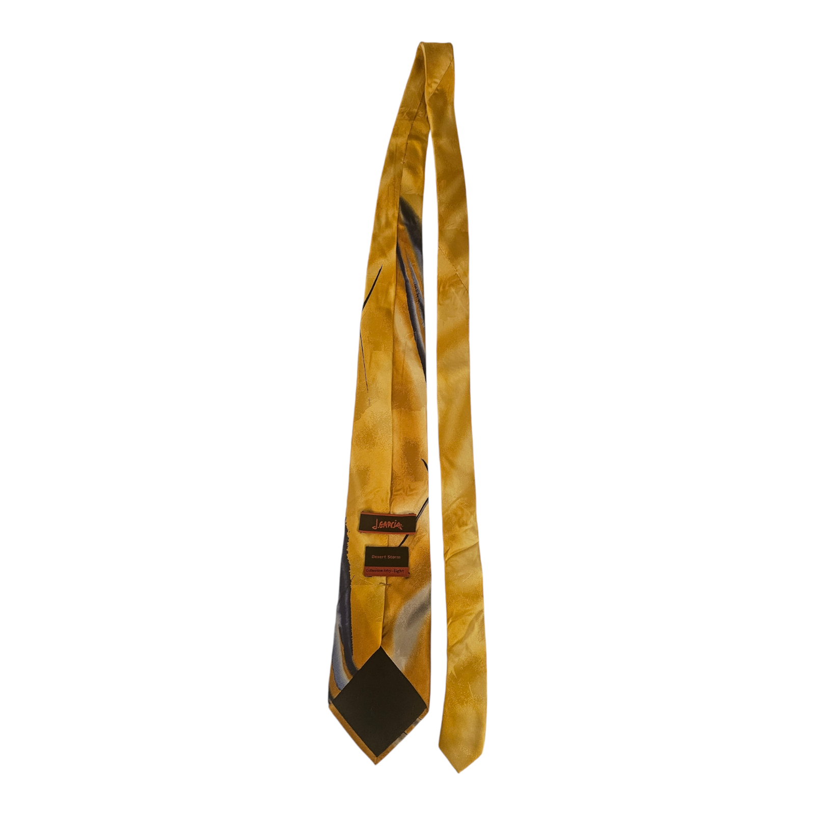 Introducing the J. Garcia Collection Fifty-Eight 58 Desert Storm Neck Tie, measuring 59" x 3 5/8". This stylish tie features a geometric pattern in yellow, black, gold, and blue colors, perfect for adding a pop of color to any outfit. Made of 100% silk fabric, this tie is both durable and luxurious.