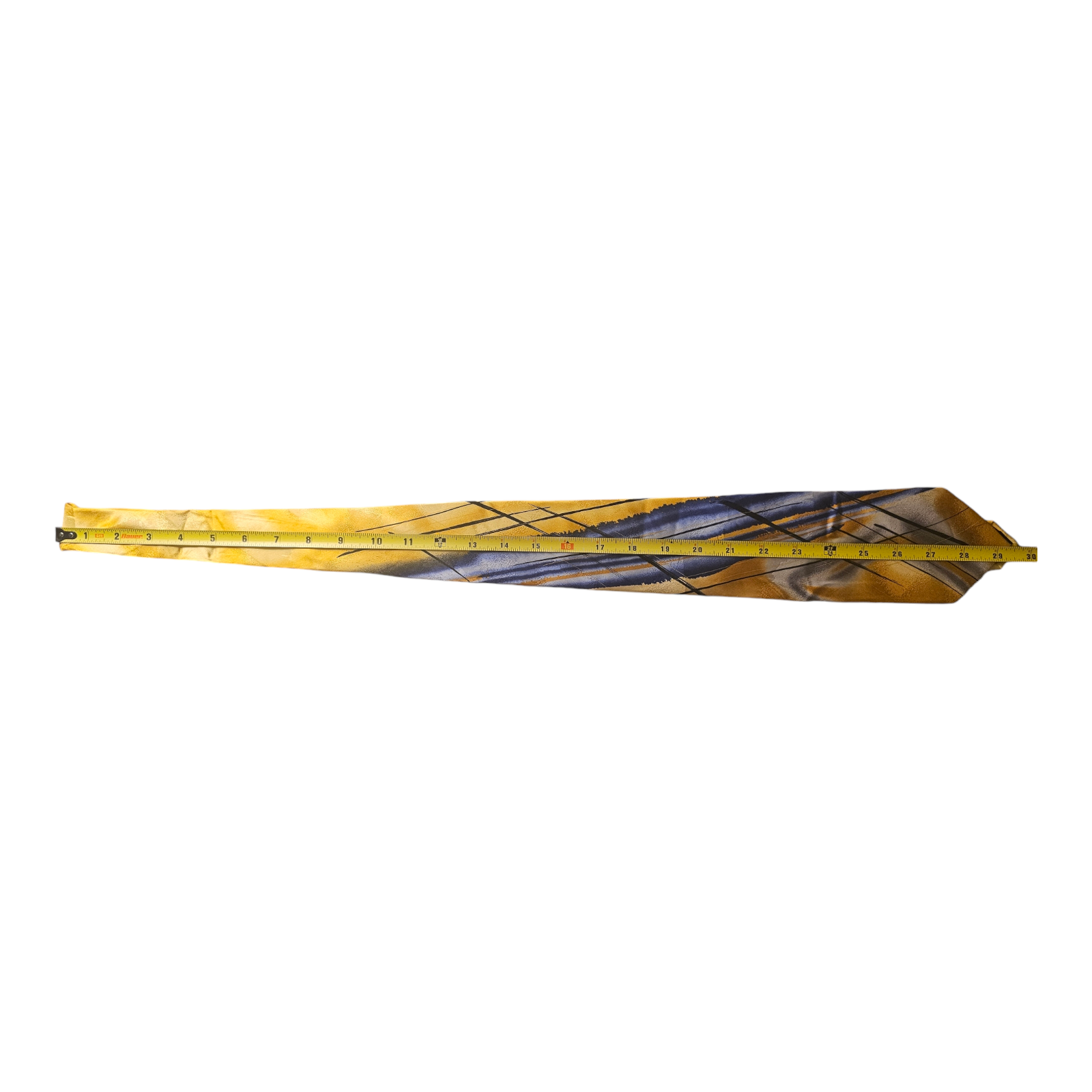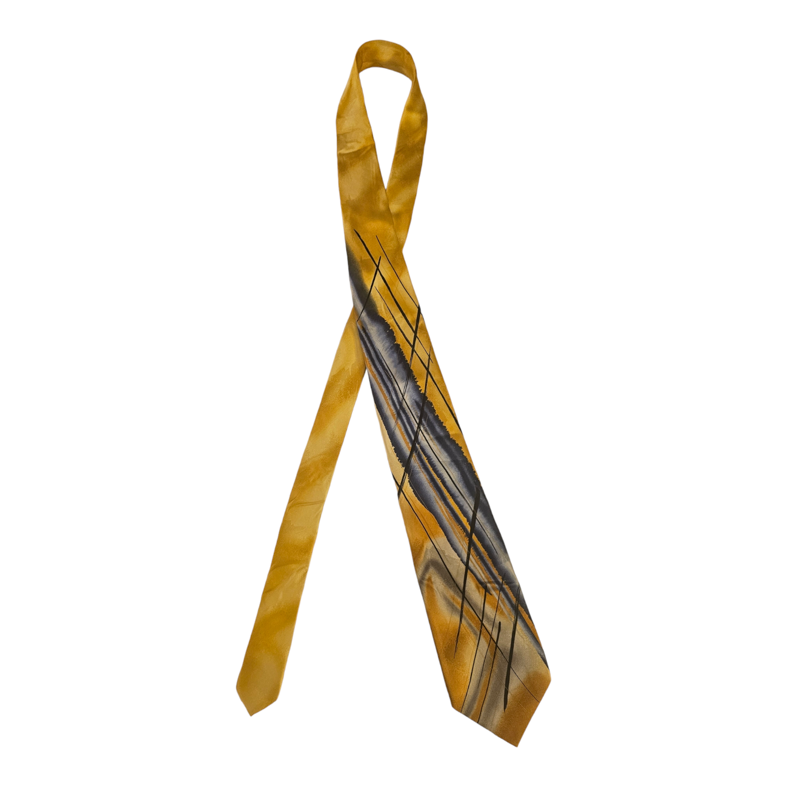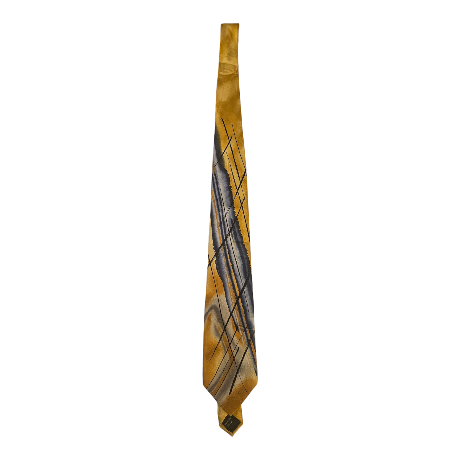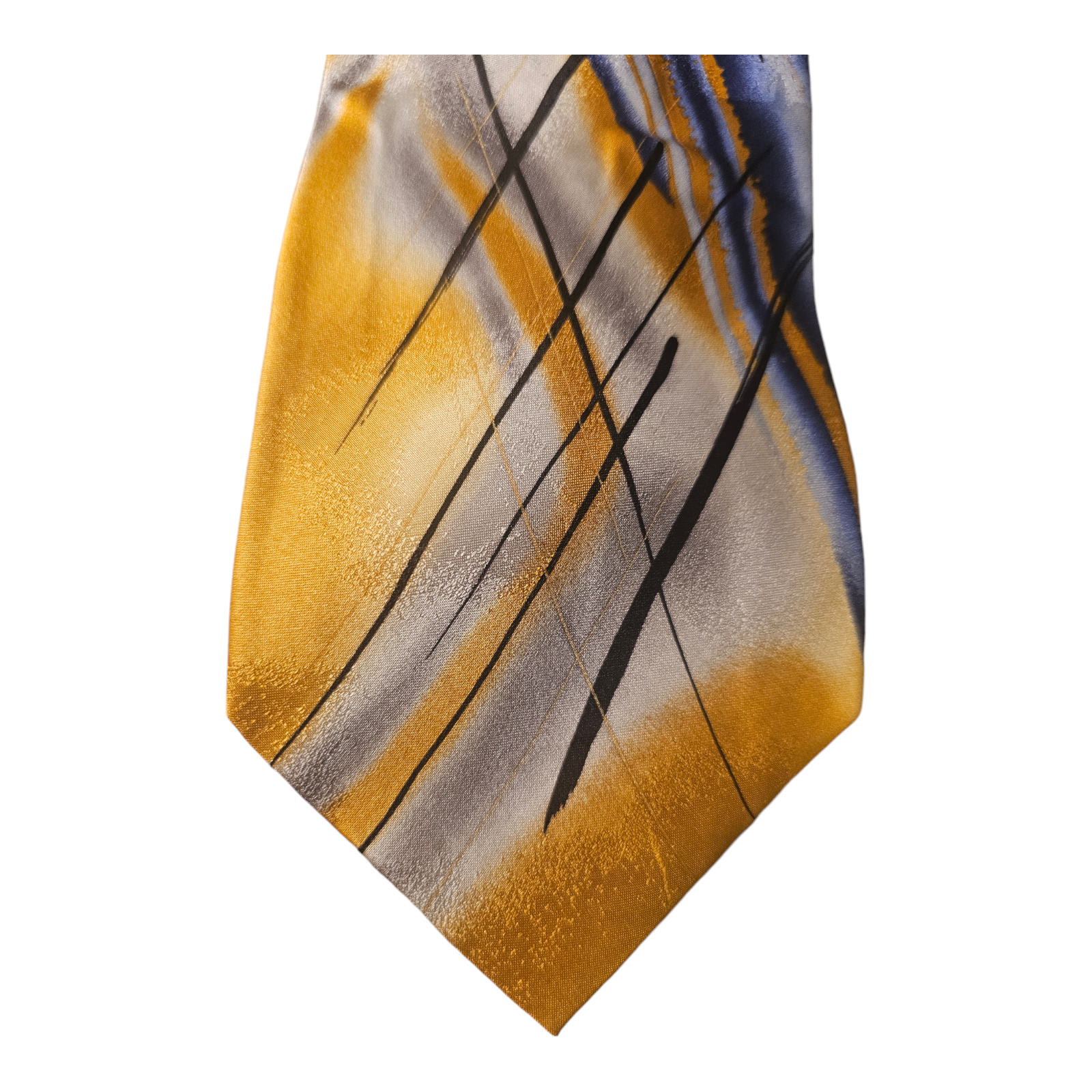 Introducing the J. Garcia Collection Fifty-Eight 58 Desert Storm Neck Tie, measuring 59" x 3 5/8". This stylish tie features a geometric pattern in yellow, black, gold, and blue colors, perfect for adding a pop of color to any outfit. Made of 100% silk fabric, this tie is both durable and luxurious.